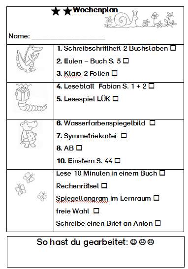 Dienstags bekommen die Kinder immer den neuen Wochenplan. Meistens habe ich einen Ein- und Zweistern-Wochenplan, der dem Leistungsniveau des Kindes gerecht wird. Unten hab ich ein Beispielexemplar von einem Zweisternwochenplan angehängt. Im Wochenplan gibt es Angebote aus den Bereichen Lesen, Schreiben, Rechnen (siehe Symbole) und manchmal MeNuk.