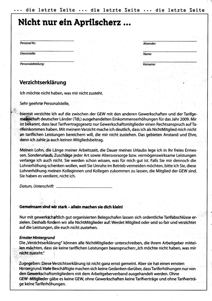 Ich hols noch mal hoch. Heute begegnete mir auf der GEW-Zeitung eine nette Verzichtserklärung, die kein Aprilscherz sein soll. Hat die noch jemand gesehen? Wer würde die denn freiwillig hier wohl unterschreiben von den Nicht-Mitgliedern. Finde es aber sehr passend.