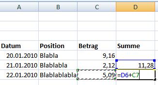 Siehe Anhang. Die Formel von D7 einfach nach unten ziehen, dann hast Du immer gleich die Summe.