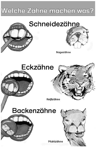habe in einer Woche einen UB zum Thema "Funktionen von Zähnen". Die Kinder sollen dann versch. Nahrungsmittel bewusst kauen und erkennen, dass Schneidezähne "schneiden", Backenzähne "mahlen" und Eckzähne "reißen" (die Eckzähne haben heutztage ja leider keine wirkliche Funktion mehr)...