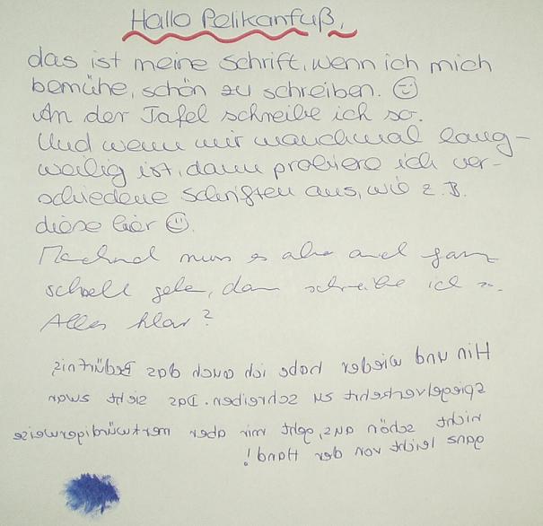 Habt ihr Lust, mal eure Handschriften und/oder eure Tafelschriften zu zeigen? Ich habe mich ab und an schonmal mit anderen Usern in anderen Foren über die eigene Handschrift ausgetauscht und finde, dass es unter Lehrern doch einmal interessant sein müsste. Also, ich stelle jetzt an der Grundschule fest, dass viele Lehrer auch privat wirklich in lateinischer Ausgangsschrift schreiben, weil sie es sich vermutlich angewöhnt haben. In der Sek I hatte ich bisher den Eindruck, dass viele recht leserlich schreiben, aber halt Handschrift und nicht Druckschrift, weil die SuS in der Sek I ja auch schon verschiedene Handschriften entziffern können. Meistens geben sich aber nochmal extra Mühe an der Tafel und in der Oberstufe habe ich schon komplett unleserliche Schriften gesehen unter Klausuren z.B., wo ich echt Probleme hatte, das zu lesen