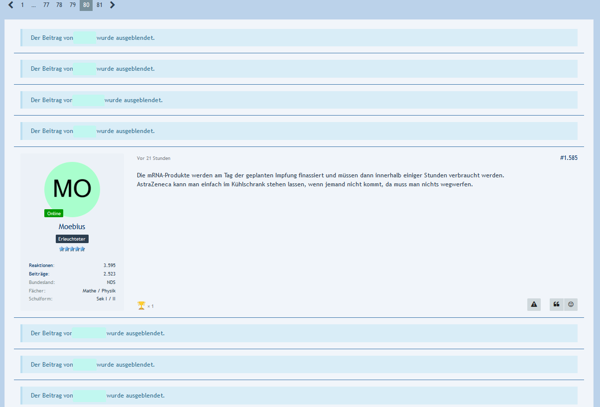 • ich habe niemand blockiert, ich möchte nicht in einer Blase leben (und gerade die ausgeblendeten - ich war neugierig - hatten/ haben für mich schon sehr interessante Beiträge geliefert, ich bin hier, um mich zu informieren, ich habe lange nur mitgelesen)