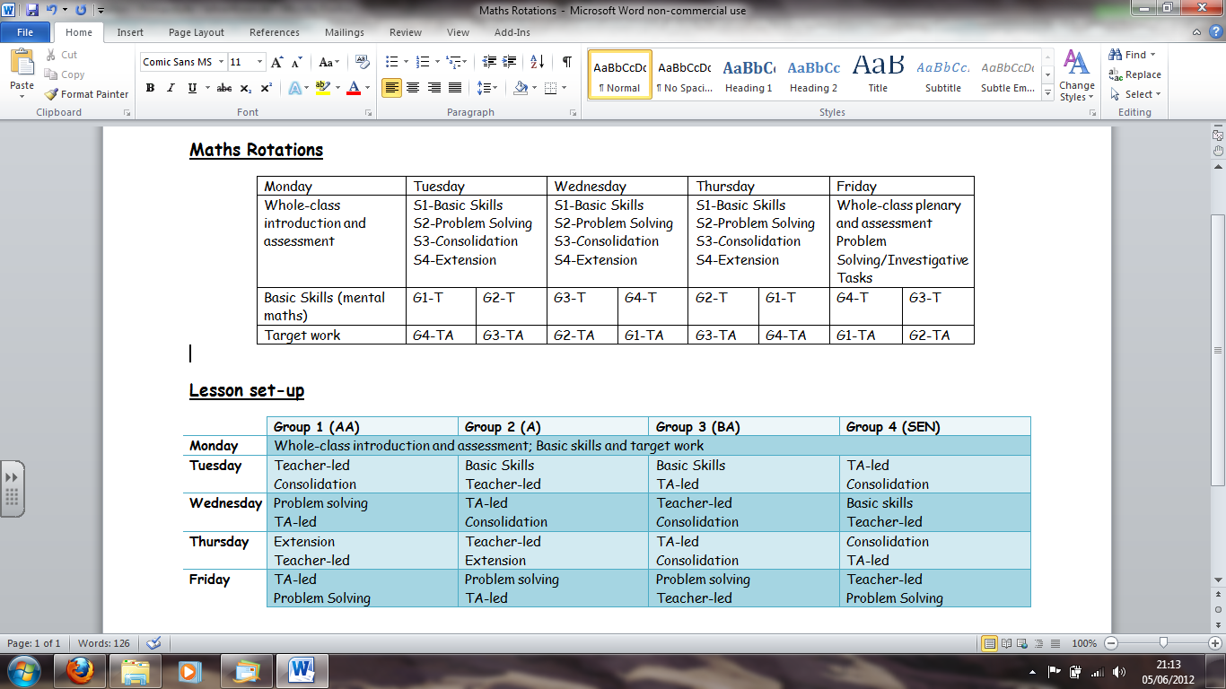 Generelle Idee an meiner neuen Schule ist, dass man fuer einen Teil der Stunde mit einer Kleingruppe arbeitet und Schueler fuer die Stunden in ihren verschiedenen Gruppen arbeiten. Nun will ich meine Schueler aber nicht fuer die gesamte Stunde sich selbst ueberlassen, weil sie nicht in "meiner" Gruppe sind...und mehr als zwei Gruppen will ich pro Stunde eigentlich nicht haben. Ich hab's nun also so aufgeteilt, dass jede der vier Gruppen etwa fuer 30 Minuten pro Stunde mit einem Erwachsenen arbeitet (entweder mit mir oder mit dem teaching assistant) und 30 Minuten alleine bzw. als Gruppe ohne Erwachsenen. Die Stunden sind also in zwei Abschnitte eingeteilt. Ist das so einigermassen verstaendlich und ok? Irgendwelche Tips, wie man das System verbessern koennte?