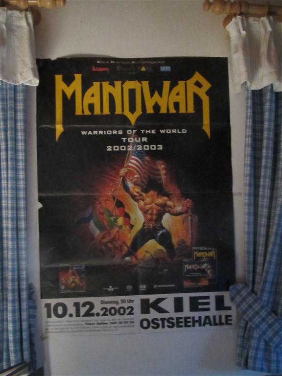 • Viele, viele Posterflaggen von diversen Alben, die sonst im Schrank verstauben würden. Und noch zwei Gitarren und ein Bass, die an einem Haken hängen, weil sonst kein Platz da wäre.