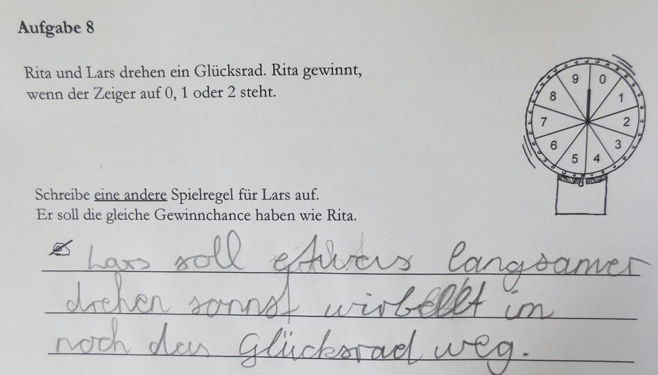 Das gefällt mir! Die Frage fand ich eh blöd. Vielleicht hat der Schüler ja selber schonmal ein Glücksrad beim Drehen umgeworfen, wer weiß?