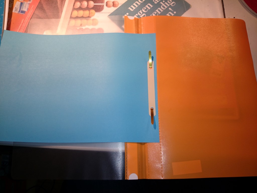 Ähnlich wie das quergelegte A3-Blatt funktioniert es auch mit einer Propekthülle. Diese heftet man mit der Tasche nach links. Handelt es sich um eine Mappe, die täglich mit mehreren Arbeitsbögen gefüllt wird, wird es sich allerdings weniger eignen, da die Gesamtzahl der Blätter in der Mappe begrenzt ist, da man die Folie immer darüber klappen können muss. Nimmt man nur ein A3-Papier kann man das ja mitwachsen lassen. Dafür fehlt aber der Schutz, den eine Prospekthülle bietet.