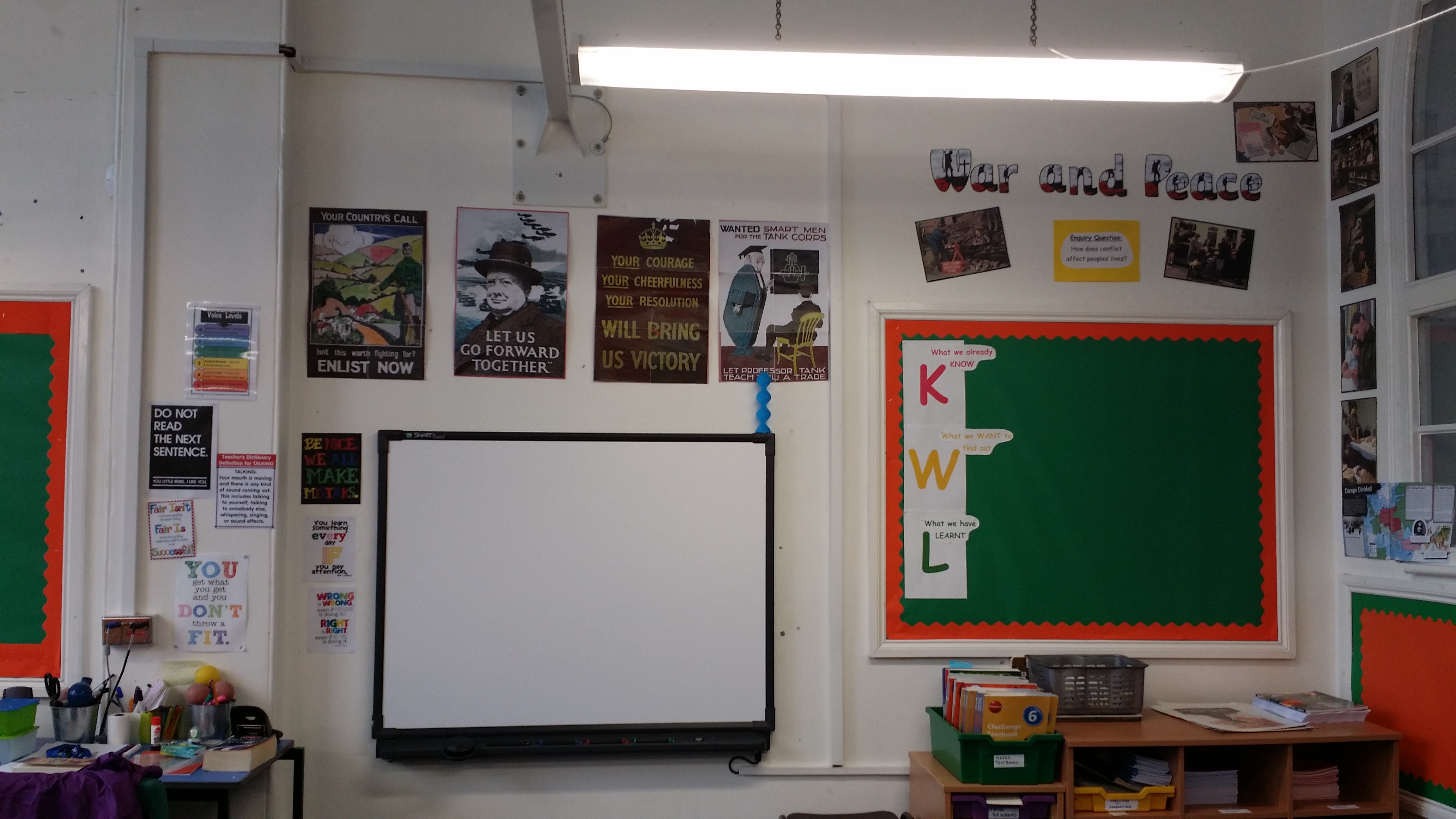 Unser Thema ist auf "Konflikt" und dessen Wirkung auf die Menschen. Die Poster haben meine Schueler vor den Ferien gemacht (wir haben da schon ein bissl Propaganda und sowas behandelt), allerdings benutzen wir sie eher als Denkanstoss. So haben wir heute mit unserem Buch angefangen und einer der Charactere ist Churchill. Daraufhin hat einer meiner Jungs gleich ganz begeistert auf's Poster gezeigt und konnte dem Rest der Klasse erzaehlen, wer das denn war. Es hat ihnen geholfen den Text etwas besser einzuordnen und den Kontext eher zu verstehen.