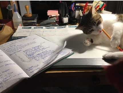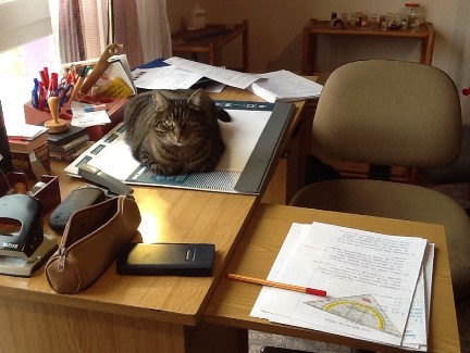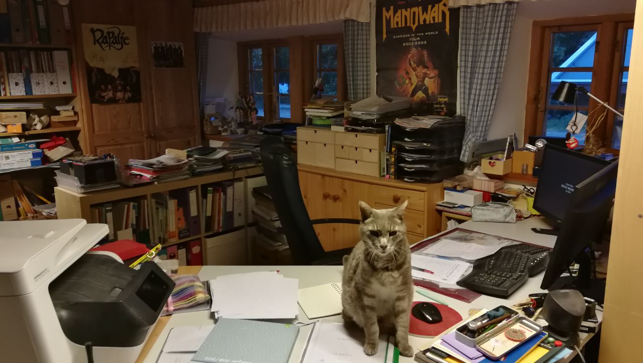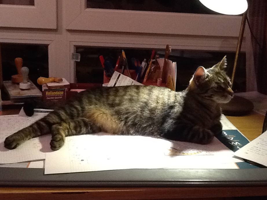 Ach, das kann ich noch toppen. Zum Glück habe ich die ausziehbare Platte, auf der ich bisweilen korrigiere, wenn meine Katze den Rest des Schreibtisches in Beschlag nimmt und sich auch nicht vertreiben lässt. Natürlich könnte ich die Katzen aussperren und die Tür hinter mir schließen, aber mein Kater hat herausgefunden, wie man eine Tür öffnet.
