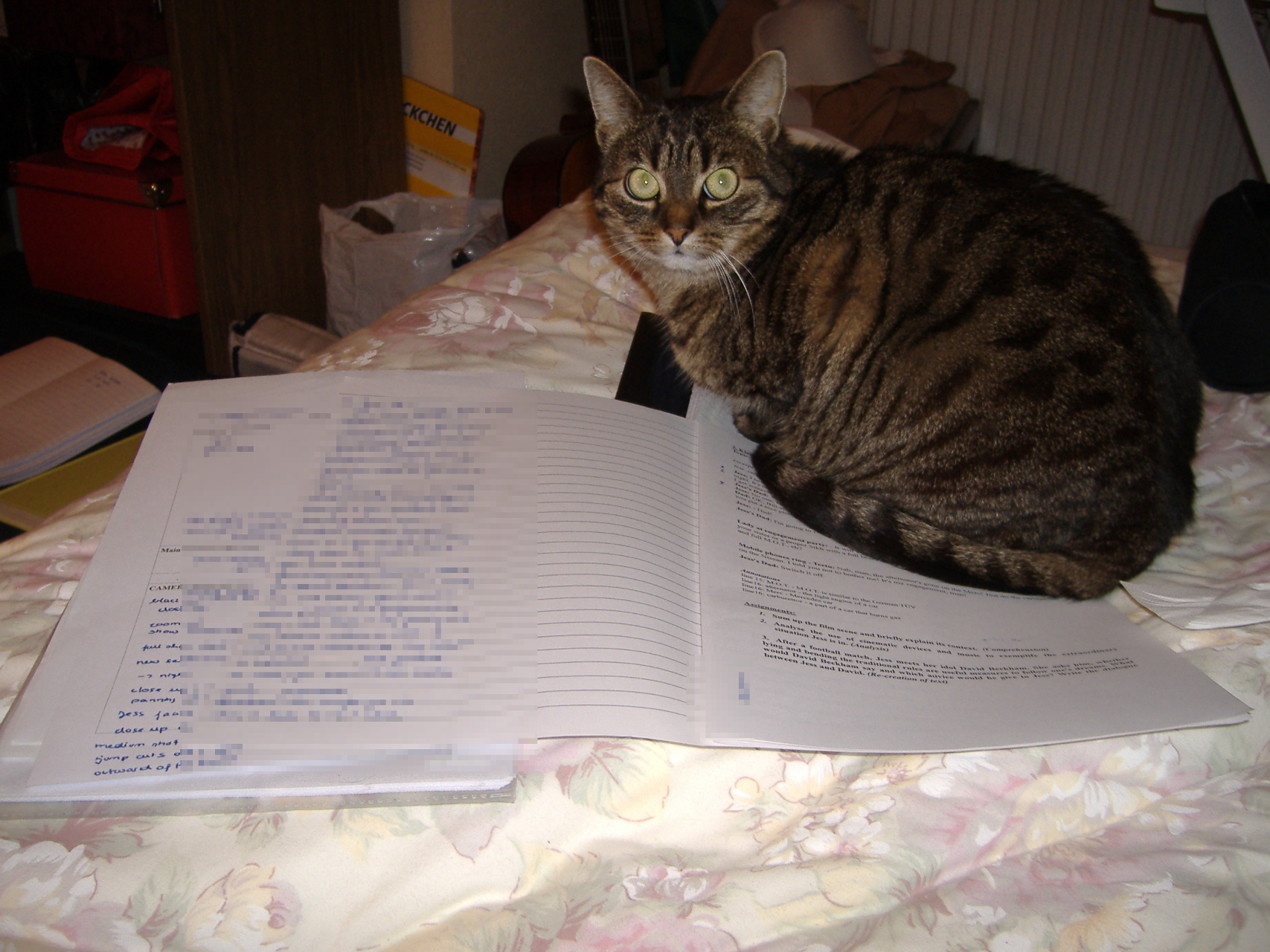 Nun, nicht ganz ein Schreibtisch. Das waren so ungefähr die ersten Oberstufen-Klausuren im Ref und es waren Weihnachtsferien, so dass ich sie mit auf Familienbesuch nahm und auf dem Gästebett korrigierte: Englisch, Filmanalyse zu einem Ausschnitt von Bend it like Beckham. Schwiegermuttis Katze erinnert mich immer an den Hund mit den tellergroßen Augen aus dem H.C. Andersen-Märchen.