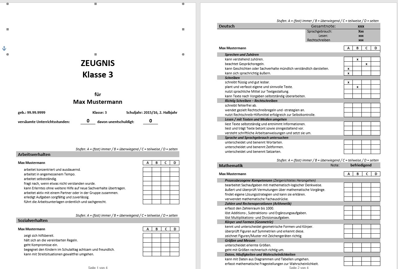 So ein Rasterzeugnis haben wir auch bei den Lernentwicklungsgesprächen. Wir haben es selbst entwickelt. Nachdem wir jahrelang in Bayern die zweiseitigen Berichtszeugnisse wie Kathie schon geschildert mit Word und ikuh (ikuh war gegenüber Word schon eine kleine Erleichterung) geschrieben haben (durfte an unserer Schule beides verwendet werden) probieren wir aktuell ein anderes Programm aus, das sozusagen mit aufklappbaren Rastern funktioniert, das angeklickt dann im Originalzeugnis aufeinanderfolgende Sätze "hinterlässt". So schnell haben meine Kolleginnen und ich noch nie Zeugnisse geschrieben. Raster oder rasterähnliche Programme sparen eine Menge Zeit.