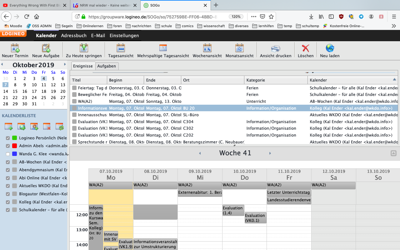 Mir ist klar, dass Moodle mit einer ausgewachsenen Groupware nicht mithalten kann. Aber die Kalendermöglichkeiten (insbesondere, weil jeder Kurs ja einen eigenen Kalender haben kann) sind trotzdem nicht schlecht, mit etwas Geschick kann man (so stelle ich es mir vor) gut die Verantwortlichkeit für bestimmte Teilkalender verteilen und jeder kann die Kalender abonnieren (in diesem Fall: Dem entsprechenden Kurs, der in diesem Fall mehr eine Organisationseinheit ist, beitreten) oder nicht.