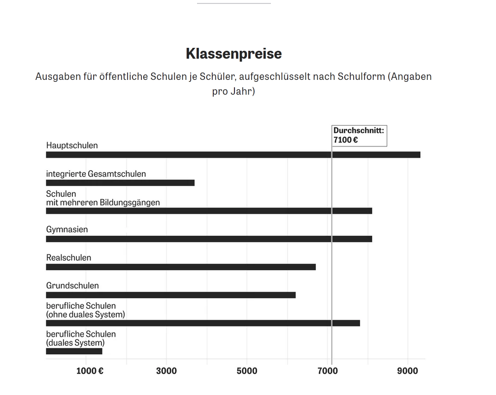 Die Kosten pro Schüler und Schulform sind von https://www.destatis.de/DE/Themen/Gese…publicationFile , dort auf Seite 51(PDF Seite 52) unten. Die Zahl für die Gesamtschulen ist falsch. Man kann drauf kommen, indem man feststellt, dass die allgemeinbildenden Schulen bei den Kosten absteigend sortiert sind und die Gesamtschule dann nicht in die Reihe passt. Es sind eigentlich 8200€. Der Teil fürs duale System stimmt auch nicht.