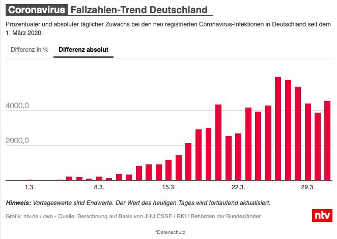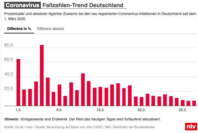 Wir pendeln jetzt seit 9 Tagen etwa zwischen 4000-5000, das ist eine Waagerechte. (Eine Waagerechte bei den absolute Zahlen würde keinen Sinn machen, dafür müsste der Virus schlagartig verschwinden.) Und gestern und heute hatten wir mit +6,6 und +7,3 die mit Abstand geringsten Zuwächse seit Beginn der Ausbreitung in Deutschland.