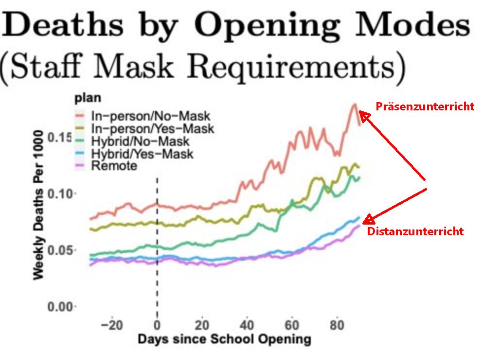Der Einsatz von nicht-FFP2 Masken hat einen geringen Effekt, der aber in Relation zu den Hybrid- und Wechselunterricht gering ist. In Counties mit durchängigem Hybridunterricht lag die Totenzahl schlussendlich doppelt so hoch, in denjenigen mit Präsenzunterricht drei Mal so hoch.