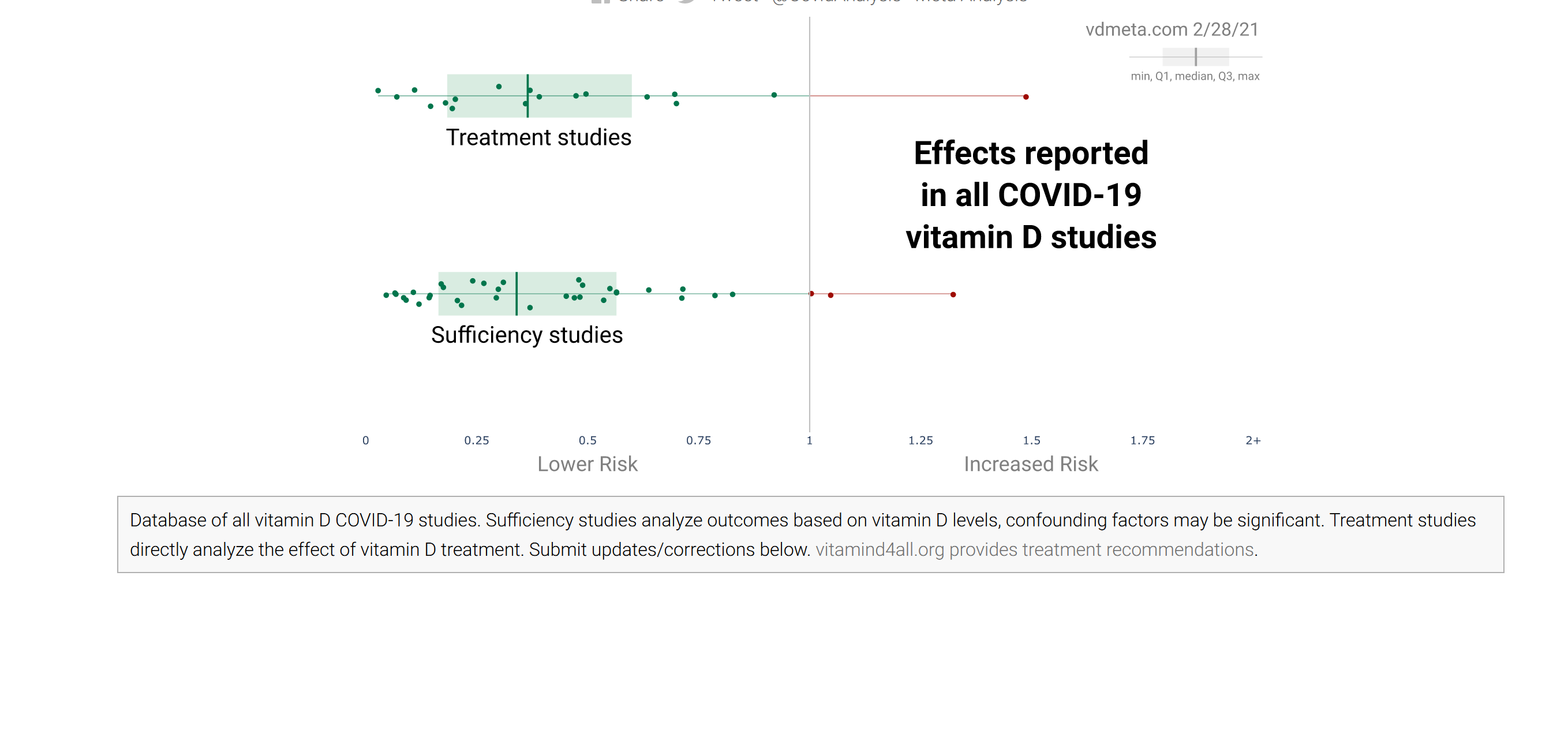 Ich weiß auch nicht warum manche sich als informiert geben, wenn sie einfach kontraproduktives Halbwissen über den angeblichen Kenntnisstand verbreiten. Als ob die Leute, die Studien dazu machen zu doof wären, die Korrelation gegenzuchecken. Du hast recht und natürlich gibt es sowohl Studien zu der Supplementierung von Vitamin D als auch zu vorher bestehenden Mängeln. Es ist gemäß der Studienlage nahezu unstrittig, dass ein ausgeglichener Vitamin D Spiegel vorteilhaft (was er im Übrigen sowieso ist, Vitamin D Mangel ist in unsere Breiten weit verbreitet). Auf der Seite findet man die wesentlichen Studien zu dem Thema und kann sich als Grafik (wie unten) die Effektstärken auf den Krankheitsverlauf anzeigen lassen und sich selbst ein Urteil bilden (auch für andere Medikation).