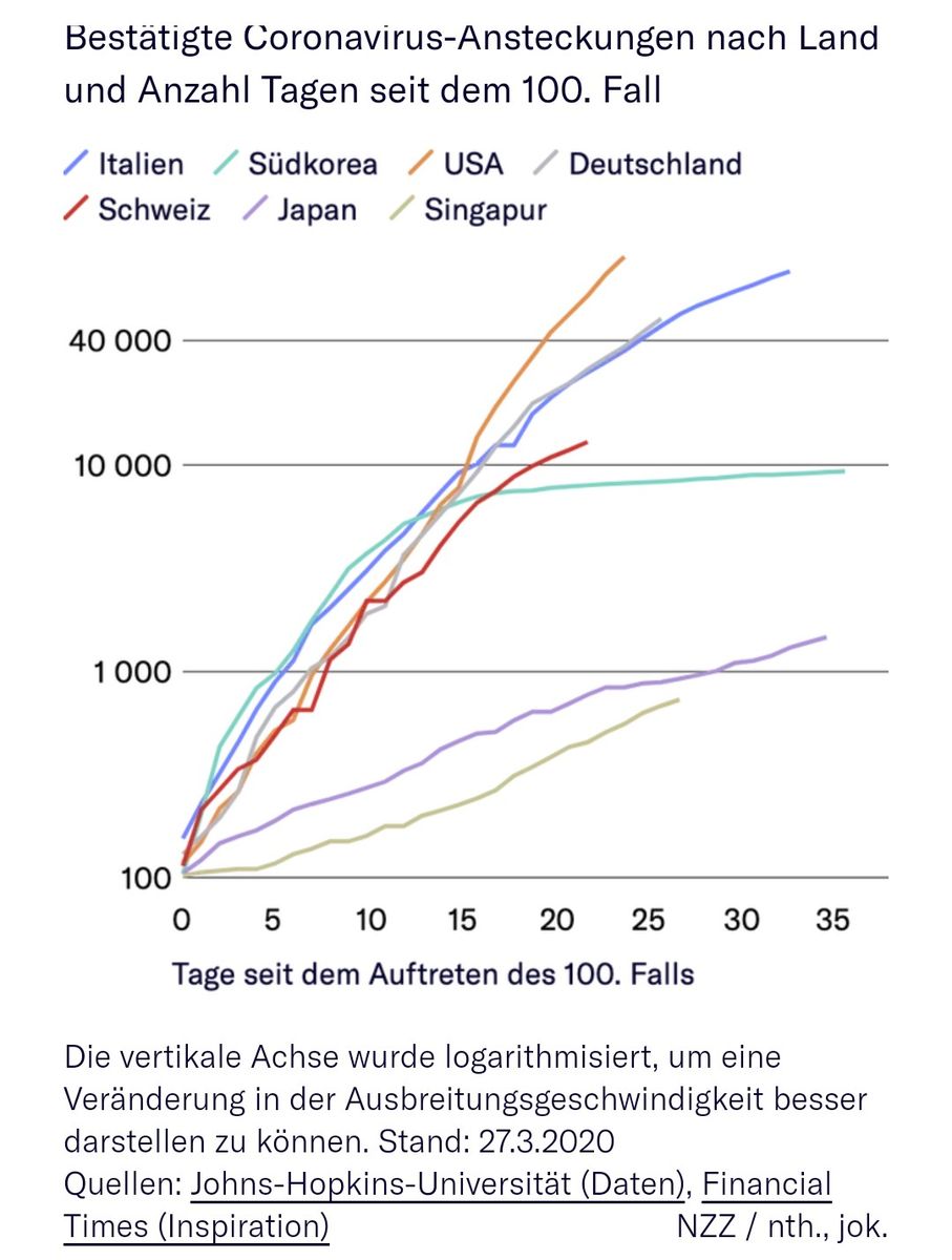 Hier mal noch eine hübsche Graphik die zeigt, wie sich die Ausbreitung in ausgewählten Ländern im Moment beschleunigt (USA) bzw. verlangsamt (yeah... unsere Kurve knickt sowas von ab!!!):