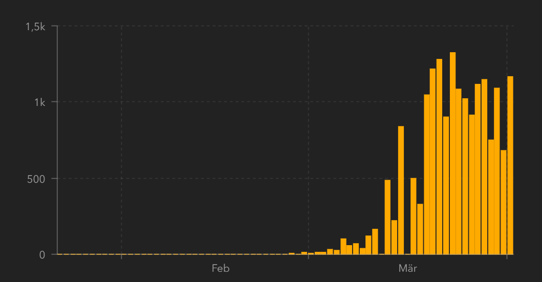 Ja. Hast Du mal geschaut, wie viele Infektionen pro Kopf wir haben? Das musst Du wenn schon relativ dazu betrachten und nicht zur Gesamteinwohnerzahl. Das schreibe ich hier die ganze Zeit schon, dass wir seit ungefähr Fasnacht so massiv betroffen sind wie sonst kein anderes europäisches Land (zunächst im Anstieg der Fallzahlen und dann auch in Fallzahlen pro Kopf). Wobei uns unterdessen Spanien in Fallzahlen pro Kopf dann doch mal überholt hat. Erstaunlicherweise haben wir seit den Ausgangsbeschränkungen die Lage aber deutlich besser im Griff als alle um uns herum. Die spannende Frage ist - warum? Also das ist eine ernst gemeinte Frage.