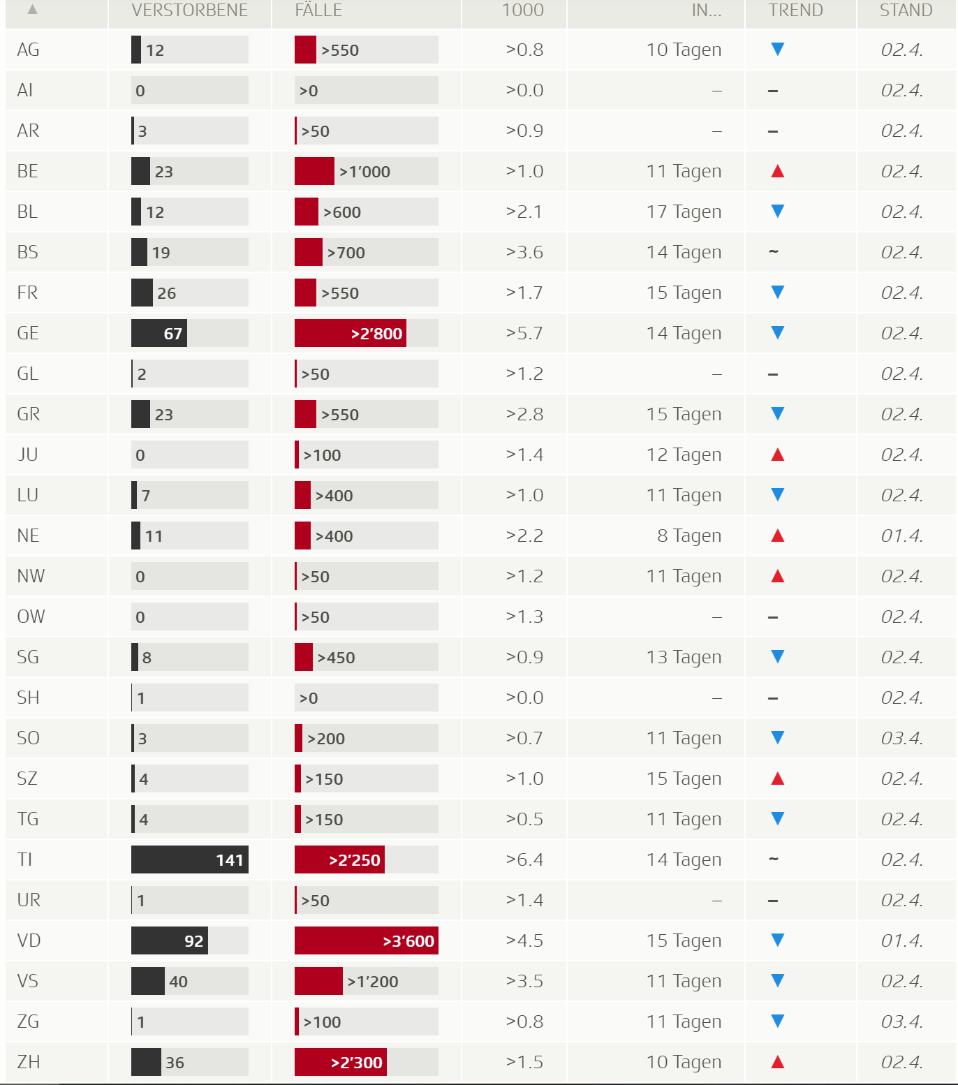 pasted-from-clipboard.pngDass es in Zürich jetzt wieder hochgeht liegt auch daran, dass die angefangen haben wirklich flächendeckend zu testen. Die Waadt (VD) meldet immer als letzter Kanton, setzt auch manchmal einen Tag aus. Das erklärt, warum in der Gesamtübersicht die Balken von einem Tag auf den anderen immer so springen, die Waadt hat viele Infektionsfälle.