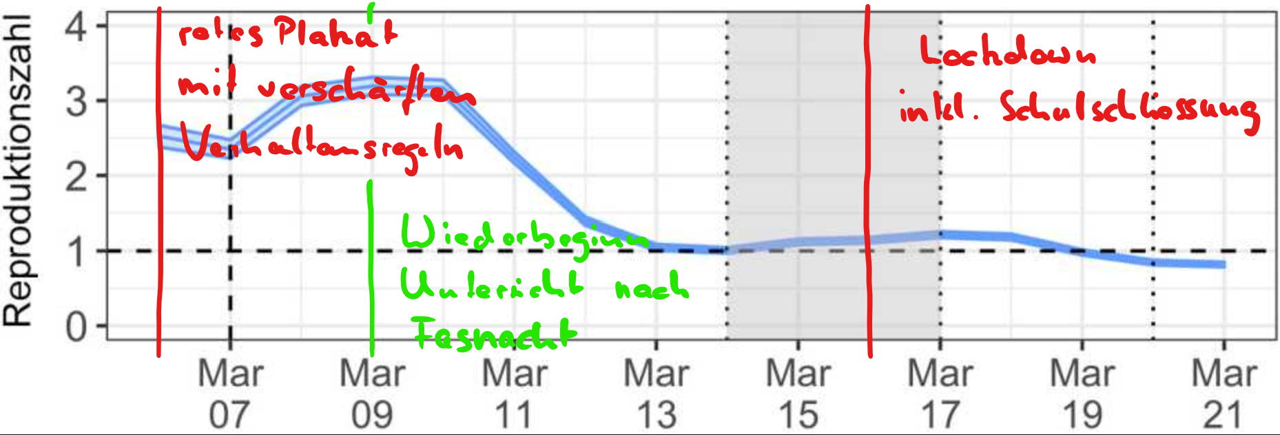 • 6. März: Rotes Plakat mit verschärften Verhaltensregeln + 1 Woche Inkubationszeit und R0 ist von leicht über 3 fast auf 1 gesunken.
