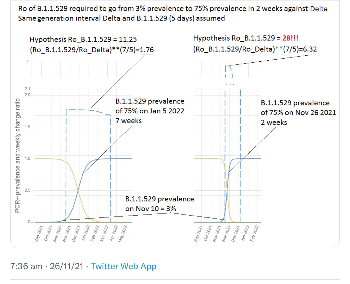 Neues von Omicron: Vorläufig projektierter R-Wert 28(!sic!). Ein ähnliches, polymutiertertes Spike mit einem Großteil der vorhandenen Mutationen zeigte keine nennenswerte Neutralisation mehr durch bisherige Antikörper in einem vorherigen Experiment. Es wäre gut, bevor man Maßnahmen zerredet erstmal das Vorstellungsvermögen dazu zu nutzen, was in Zukunft noch auf uns zukommen kann / wird. Wer so gerne von Verhältnismäßigkeit redet, sollte auch mal die Mühen von Schutzmaßnahmen mit den Folgen eines Unterlassens ins Verhältnis setzen. Die stellen sich nämlich auch gerne mal exponentiell ein.