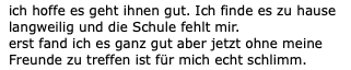 Was mir allerdings ganz stark auffällt und mir ganz große Sorgen bereitet, ist, dass dieser Zustand, in dem wir "unterrichten" (ja, ich setze es in Anführungszeichen, weil das für mich nur ganz entfernt so etwas wie Unterricht ist), für Kinder aus bildungsfernen Haushalten absolutes Gift ist. Die Kinder, die schon in der Schule nichts hinbekommen, weil ihnen zu Hause die Unterstützung fehlt, melden mir gar nichts zurück.