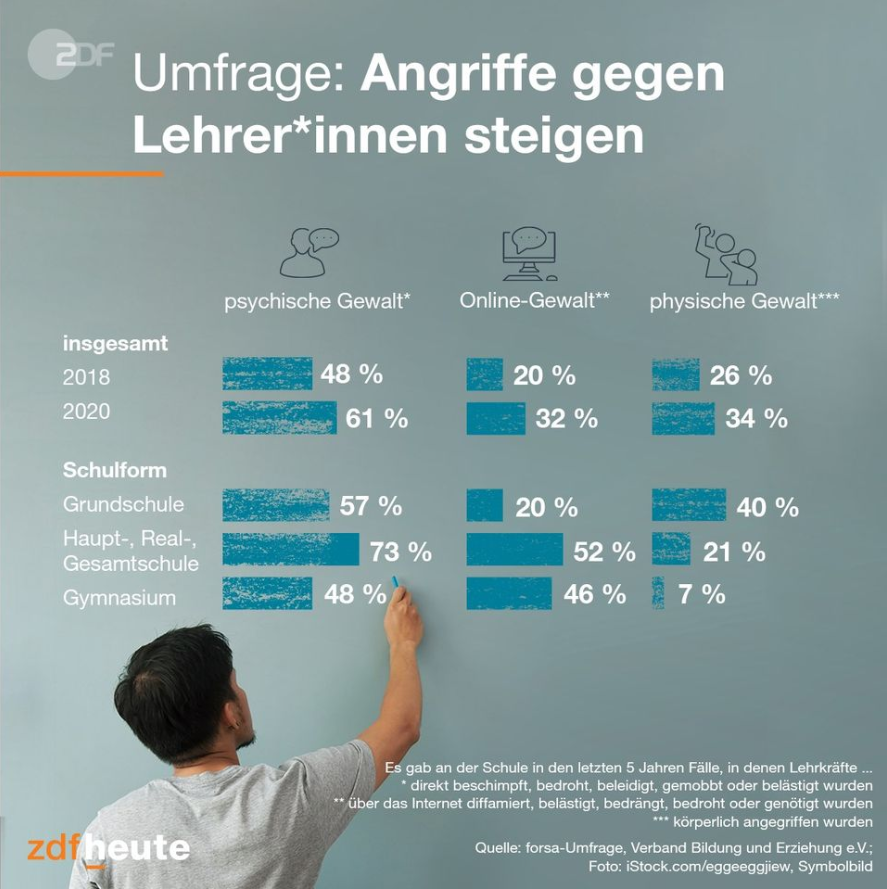 Heute wundert es mich manchmal, wie "brav" und "angepasst" die heutige Schülergeneration ist. Daher kann ich den Befund der neuerlichen Gewaltexzesse persönlich nicht nachvollziehen. Ich hab in meinem Umfeld, in den ersten 8 Jahren meines Berufslebens (4 Schulen, darunter zwei Sekundarschulen, eine Förderschule, ein Gymnasium), keine Gewalt gegen Lehrkräfte erlebt, weder mittelbar noch unmittelbar.