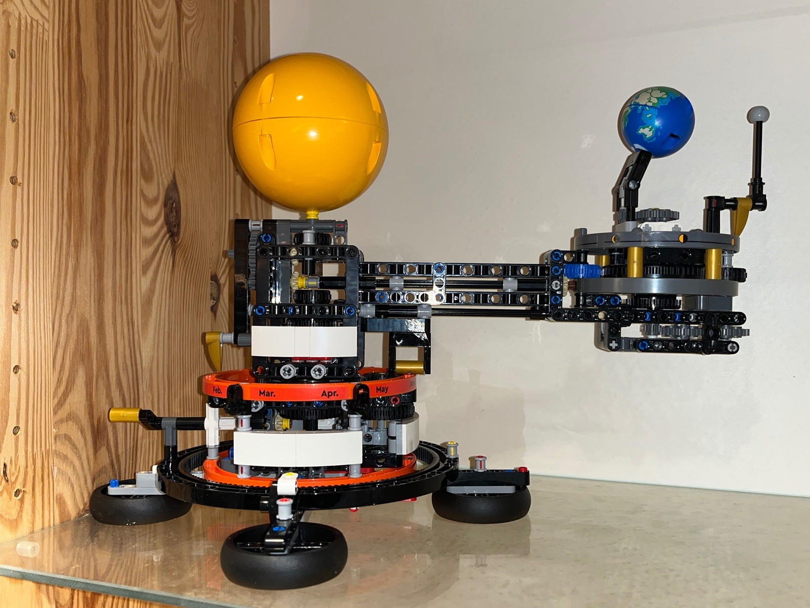 Wenn man links an der Kurbel dreht, sieht man, wie die Erde sich um die Sonne dreht und wie der Mond um die Erde.