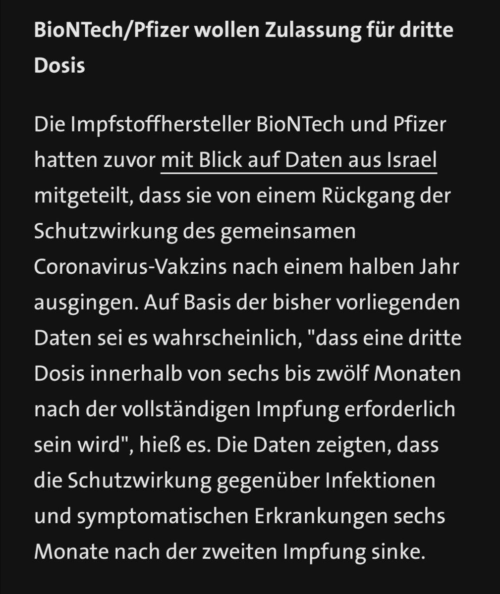 • Ja, Samu, das sind einfach die Fakten: Der Impfschutz lässt bei alten und vorerkrankten Personen nach. Was sollen sie denn Deiner Meinung nach anderes schreiben? So ist es halt und so war es auch zu erwarten. Es spielt eben nicht so eine grosse Rolle, ob eine gesunde 20jährige jetzt gerade Bock hat, sich impfen zu lassen, lieber bietet man dem 75jährigen Diabetiker eine 3. Dosis an, der stirbt nämlich mit einiger Wahrscheinlichkeit bei einem Impfdurchbruch. So viel Fakten darf man der Bevölkerung schon zumuten um sie drauf einzustimmen, dass für manche jetzt eben schon die 3. Runde starten wird obwohl die Kinderchen noch auf die 1. Runde warten. Deren Risiko ist und bleibt halt einfach sehr gering. Auch so ein Faktum eben. Vielleicht ist die STIKO-Empfehlung zur Kinderimpfung doch nicht ganz so doof, sollen ja angeblich Experten dort arbeiten. Und noch was: Hepatitis B wird auch 3 x geimpft, das Schema ist noch nicht mal ein Alleinstellungsmerkmal für die Covid-Impfung.