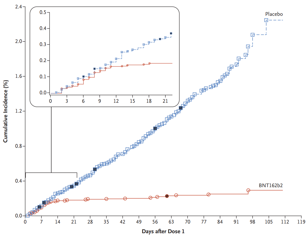 • Nein, es sind laut Studie 82 % Impfschutz nach dem die 1. Immunisierung voll wirksam ist. Ab Tag 14 nach der 1. Dosis kommt es zu signifikant weniger Erkrankungen: