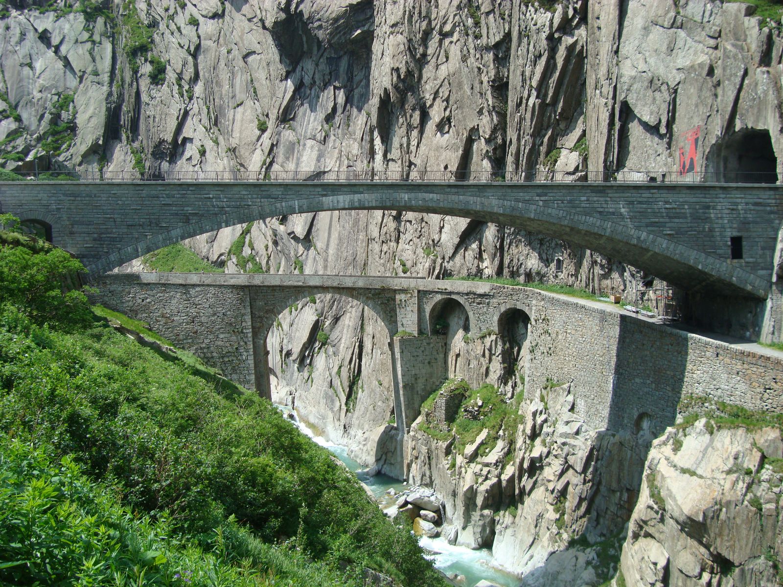• Hm, sieht nach der Teufelsbrücke bei Andermatt aus. Aber liegt da ein russisches Denkmal? Keine Ahnung.
