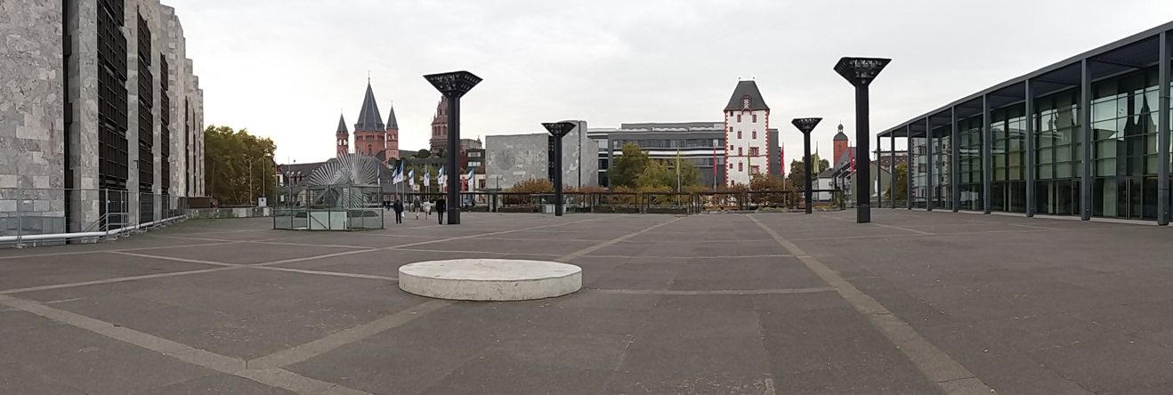 (und ich bin ziemlich sicher, dass es in der Rheingoldhalle ist, aber nur ziemlich. Peinlich, dass ich jahrelang in der Stadt studiert habe, aber nie bewusst in der Halle drin war. Links im Rathaus war ich aber schon, in mehreren Sitzungssälen und auch in seinem Keller, hinter uns ist die Rheinpromenade, zum Domplatz im Hintergrund kommt man durch eine Fussgängerbrücke.