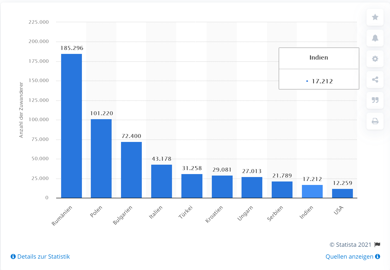 Mir ist übrigens gerade wieder eingefallen, warum ich die Sozis nicht wähle. Wegen dieser ewigen Märchen, wir würden die Welt retten, wenn wir alle reinlassen, die im Heimatland keine Arbeit finden. Und *wir* brauchen die ja für unser Rentensystem. Einen Scheiss brauchen wir, *ich* zahle hier für meine eigene Rente ein, da wird kein Schweizer jemals was davon haben. Und die ganze Argumentation mit dem Welt retten verhebt auch nicht, weil ja gar nicht die Kongolesen, deren Koltan wir ausbeuten und auch nicht die Bangladeshi, die billige T-Shirts für uns nähen, zu uns kommen. Gemäss Statistik waren es 2020 tatsächlich vor allem die von mir oben schon erwähnten Rumänen, die in grösserer Zahl nach Deutschland gekommen sind: