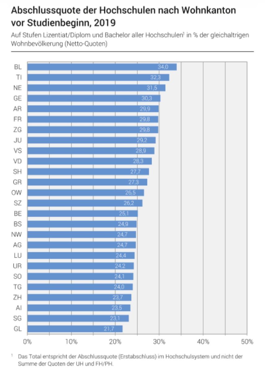 In Genf wählen mehr als 60 % der Jugendlichen beim Übertritt in die Sek II demnach den allgemeinbildenden Weg, knapp 45 % gehen ans Gymnasium. Ähnliche Zahlen für Basel und die Waadt. Im Baselland haben wir unterdessen 28 % am Gym, sorry, war mir entgangenen, dass die Quote leicht angestiegen ist. Und jetzt schauen wir nach, wie viele am Ende einen Hochschulabschluss erwerben: