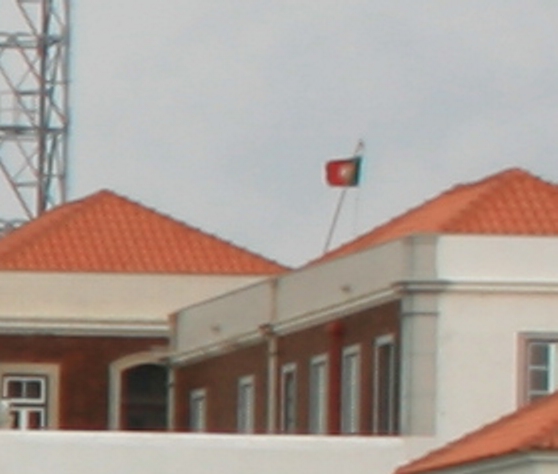 Rechts vom Funkturm auf dem Dach ist eine kleine Fahne, vorwiegend rot, mit - bei guter Vergrößerung zu erahnen - grünem Rand.