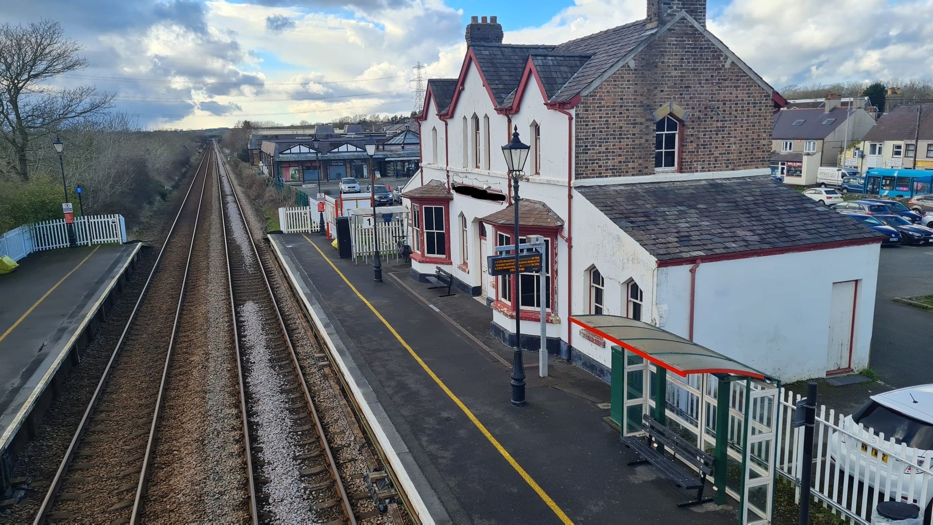 b) das lange Bahnhofsschild erkennt.