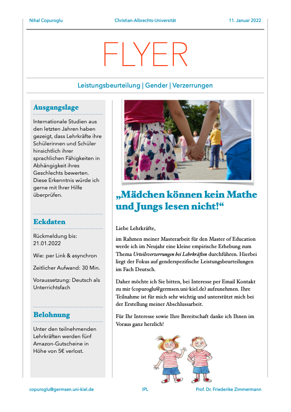 im Rahmen meiner Masterarbeit für den M.Ed. suche ich ganz dringend Lehrer:innen aus der Sek I und/oder Sek II mit Deutsch als Unterrichtsfach, die an einer kurzen Studie (max. 30 min) teilnehmen. Ich habe schon vor einem Monat einen Beitrag hierzu eröffnet, da sich aber bis jetzt noch niemand bei mir gemeldet hat, möchte ich den Radius erweitern und mich nicht auf einen Ort beschränken. Im Anhang findet ihr den Flyer und könnt euch unter der angegebenen Emailadresse bei mir melden.