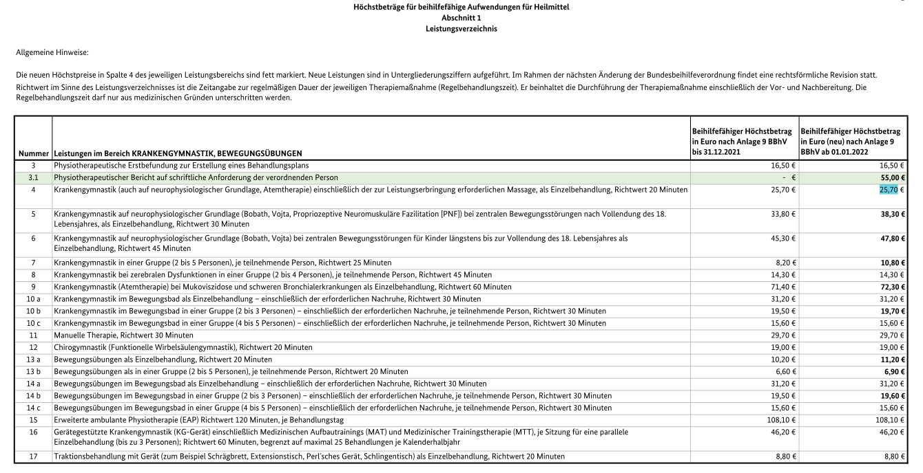 Beispiel aus dem "Informationsblatt zur Beihilfefähigkeit der Aufwendungen für Heilmittel" des Niedersächsischen Landesamtes für Bezüge und Versorgung: