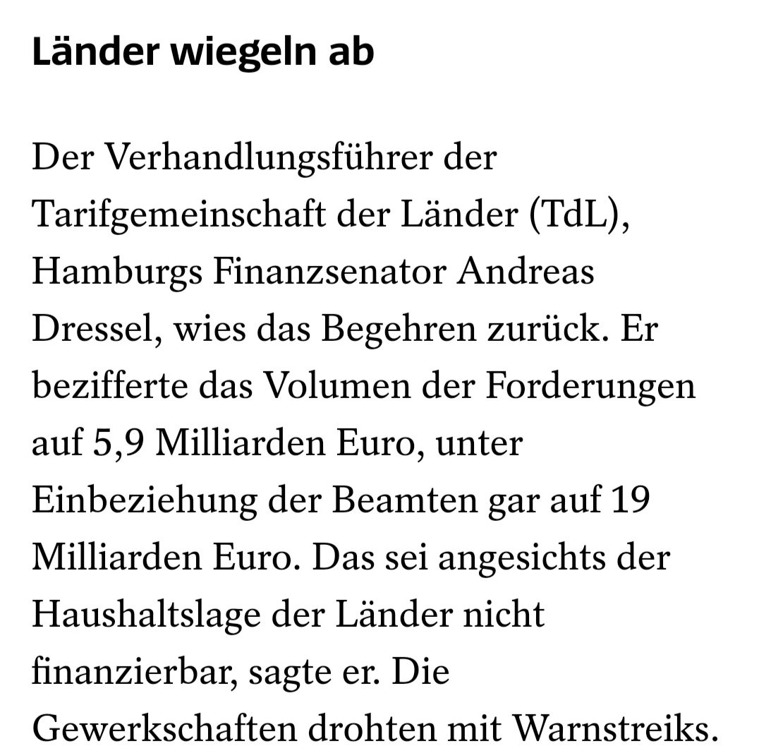 Ich bin gespannt, was unterm Strich rauskommt. Wahrscheinlich einmalig 2000 Euro Inflationsausgleich und 2,x % auf 24 Monate oder so ein Quatsch. Damit wird der Abstand zum TVöD noch größer.