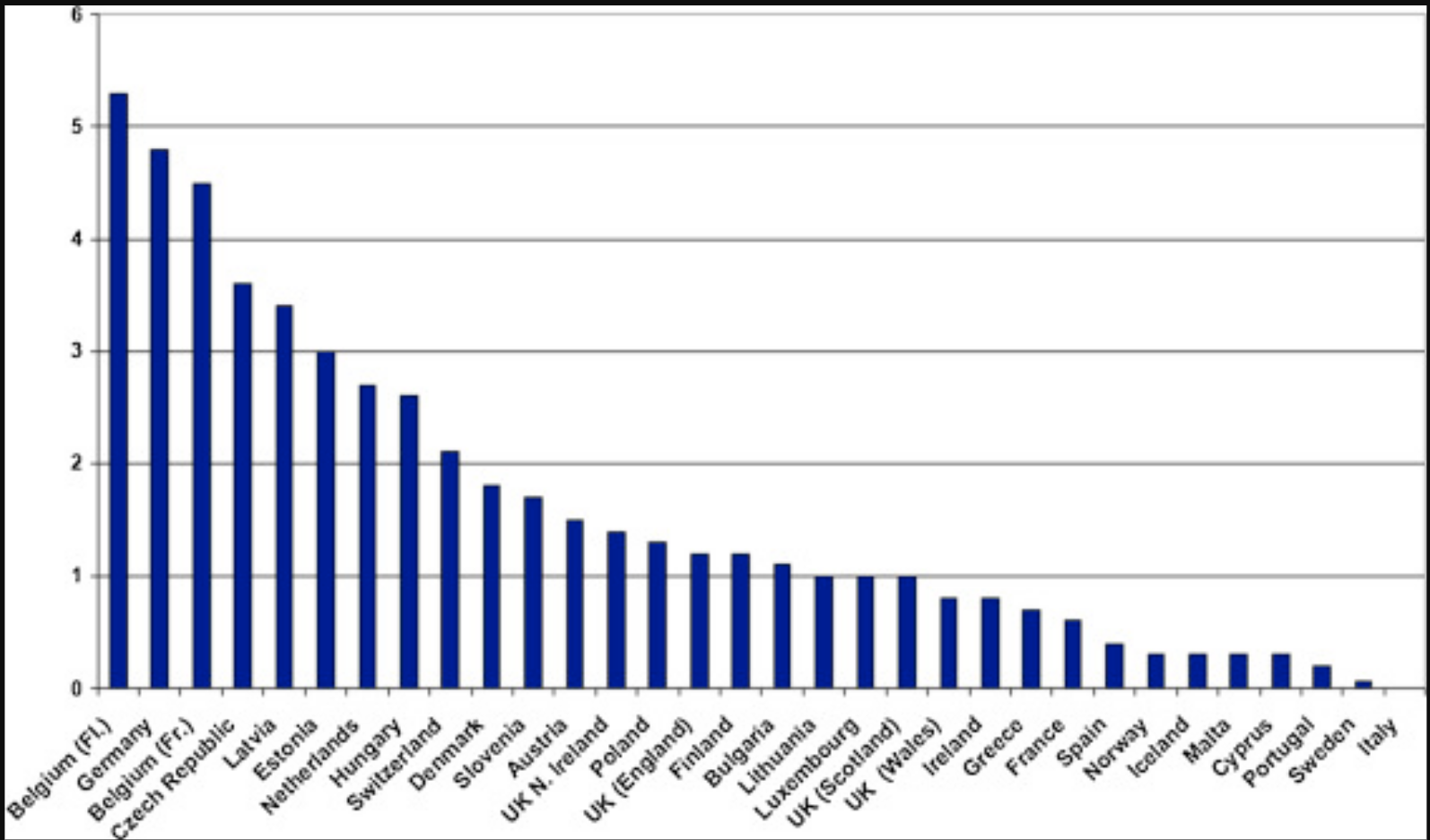 • Da ja mal der halbherzige Versuch unternommen wurde die Inklusionsrate mit dem Bildungserfolg eines Landes zu korrelieren und ich grade prokrastiniere ... Das hier sind Exklusionsraten (also SuS, die an Förderschulen beschult werden) in einigen europäischen Ländern: