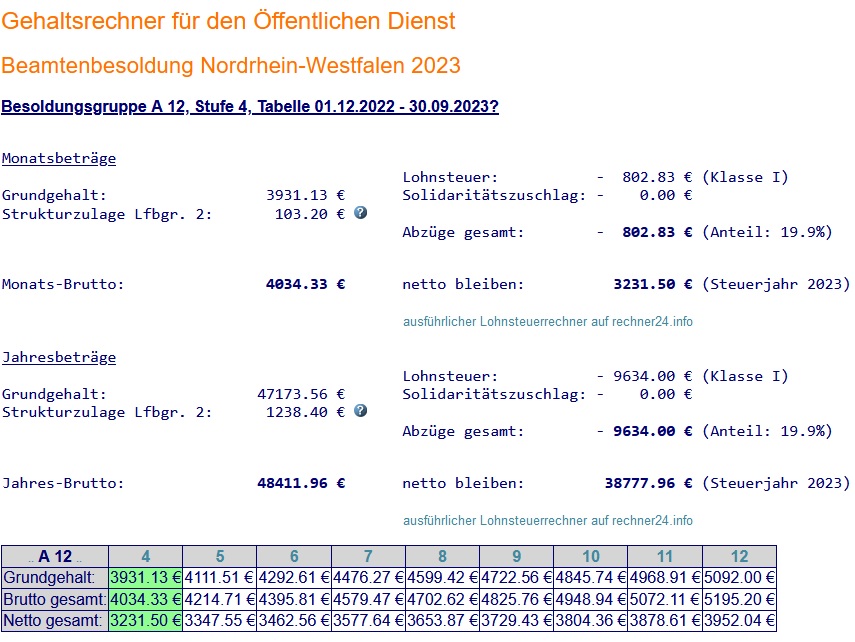 Wirst du vlt. nach einer anderen Besoldungstabelle besoldet, als die offizielle für BW? Kann ich mir kaum vorstellen. Die Zahlen sind ja kein Geheimnis und leicht nachprüfbar. A12/12 in NRW sind dann wie von Schmidt korrekt beschrieben knapp über 60k Brutto p.a. Das sieht auch bei dir in BW nicht anders aus, auch wenn die Erfahrungsstufen dort anders nummeriert sind (nicht 4 bis 12, sondern 2 bis 10) und damit A12/10 halt schon einmal 64k Brutto sind.