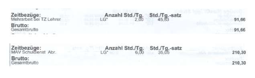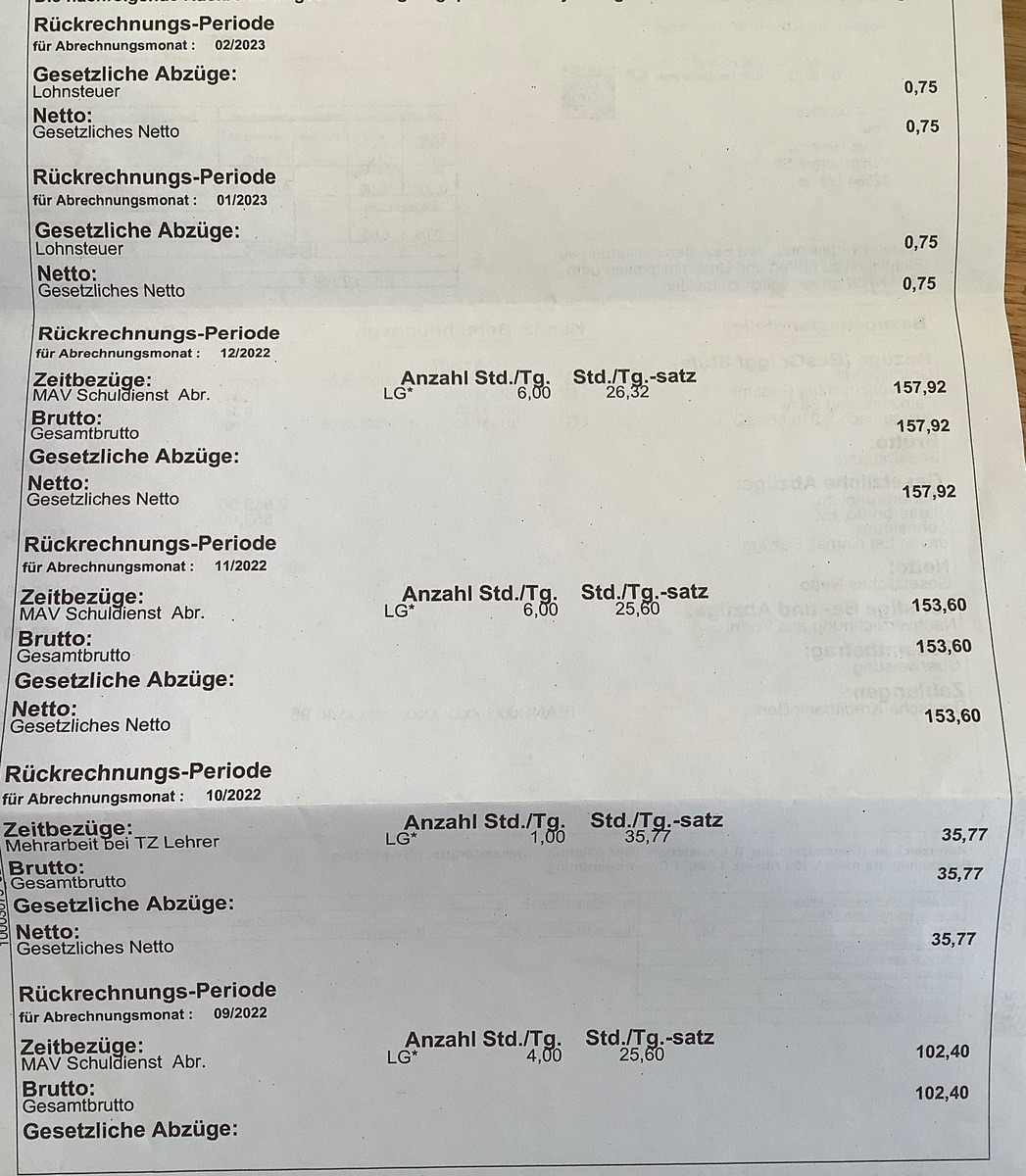 Können bitte die Teilzeitkräfte unter euch mal nachsehen, wie eine Mehrarbeitstunde bei euch abgerechnet wird. Ich habe den Fall, dass das LBV trotz gleichbleibender Teilzeit die Mehrarbeit in verschiedenen Monaten mit unterschiedlichem Betrag (Mehrarbeit bei TZ Lehrer 45,83 € oder MAV Schuldienst Abr. 35,05 €) abrechnet.
