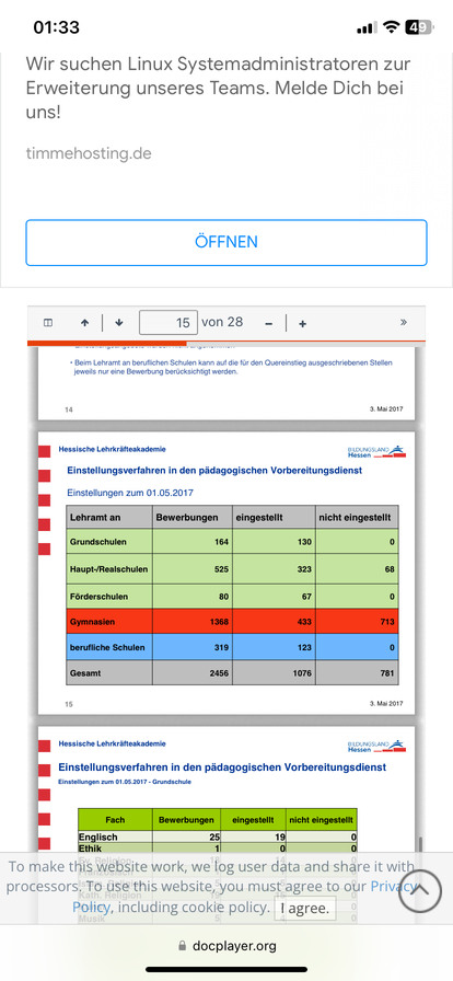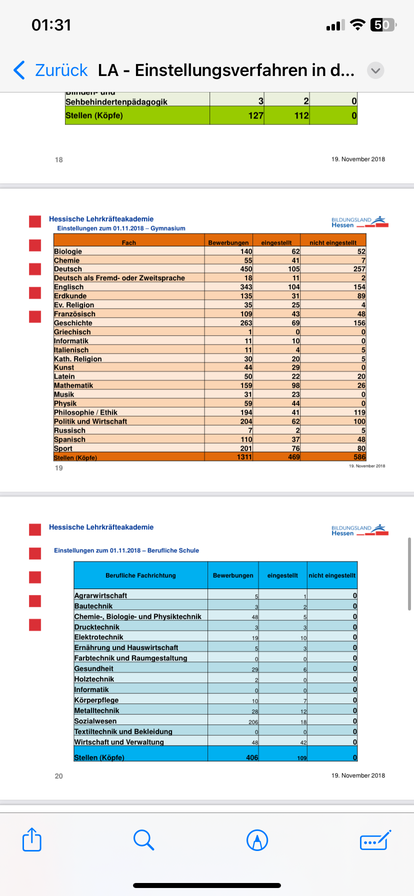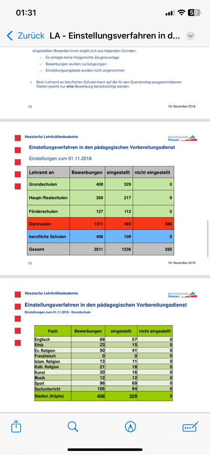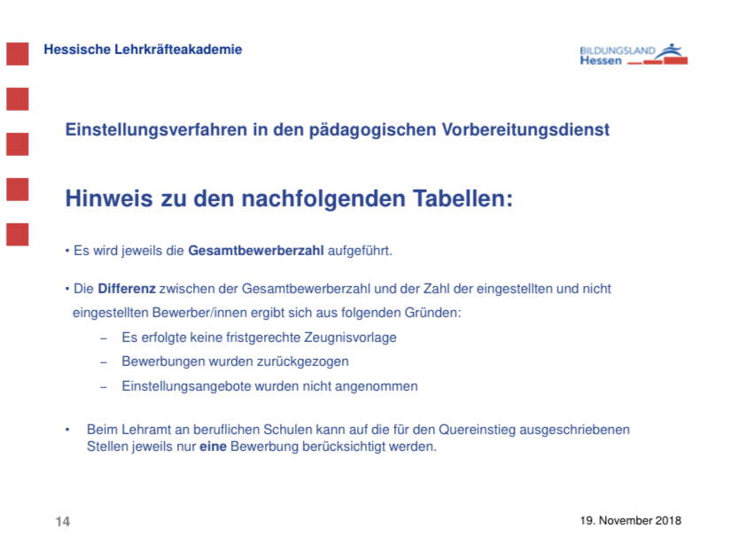 und zwar habe ich mir vom Bildungsland Hessen, die Einstellungszahlen in den Vorbereitungsdienst/Ref angesehen und musste feststellen, dass sich ja die Einstellungszahlen hinsichtlich der Schulformen gravierend unterscheidet. So wurden beispielsweise im Jahr 2018 über die Hälfte der Studierende, die das Gymnasium anstreben, abgelehnt. Über die Hälfte wurde also von der hessischen Lehrkräfteakademie nicht angenommen bzw. haben kein Angebot bekommen. Dies habe ich mir für weitere Jahre angeguckt und mir ist ein eklatanter Unterschied hinsichtlich der Schulform aufgefallen. Bei Förderschulen und Beruflichen Schulen hat nicht ein einziger Bewerber ein Ablehungsbescheid bekommen. Sie wurden alle eingestellt unabhängig davon, welche Fachrichtung sie besitzen. So wurden alle Bewerber eingestellt, die beispielsweise Wirtschaft und Verwaltung oder Elektrotechnik als Schwerpunkt besitzen. Das Bemerkenswerte hierbei ist, dass die Note im Bachelor und Master überhaupt keine Rolle spielt. Sie werden so oder so eingestellt. ,,Krasse‘‘ hierbei ist, dass dies nahezu jedes Jahr so ist. Ich habe mir für nahezu jedes Jahr die Einstellungszahlen angeguckt und bin auf das selbe Resumee gestoßen. Alle Studierende der beruflichen Schulen und Förderschulen bekamen ein Angebot, wohingegen die Häfte Gymnasiallehrkräfte und die Lehrer der Realschulen kein Angebot bekommen haben.
