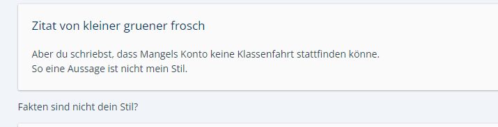 Wo war das ein Zitat? Für Zitate gibt es hier eine Zitatfunktion. Das war ein Ansprechen mit nachfolgendem Inhalt.