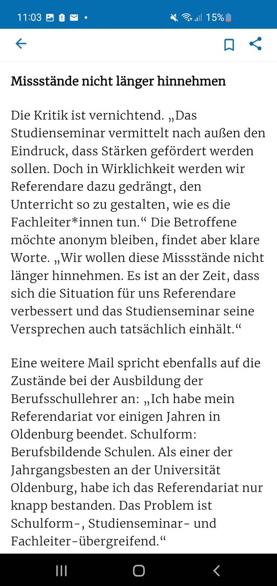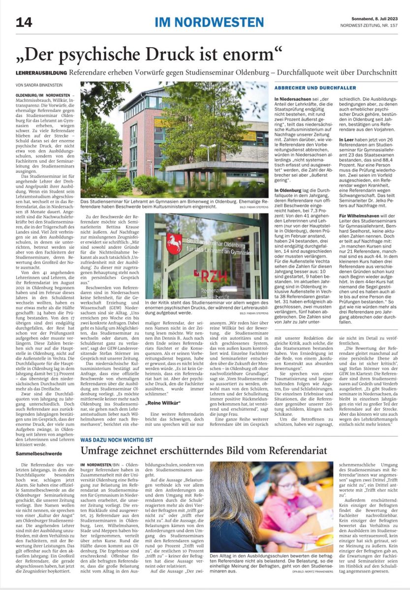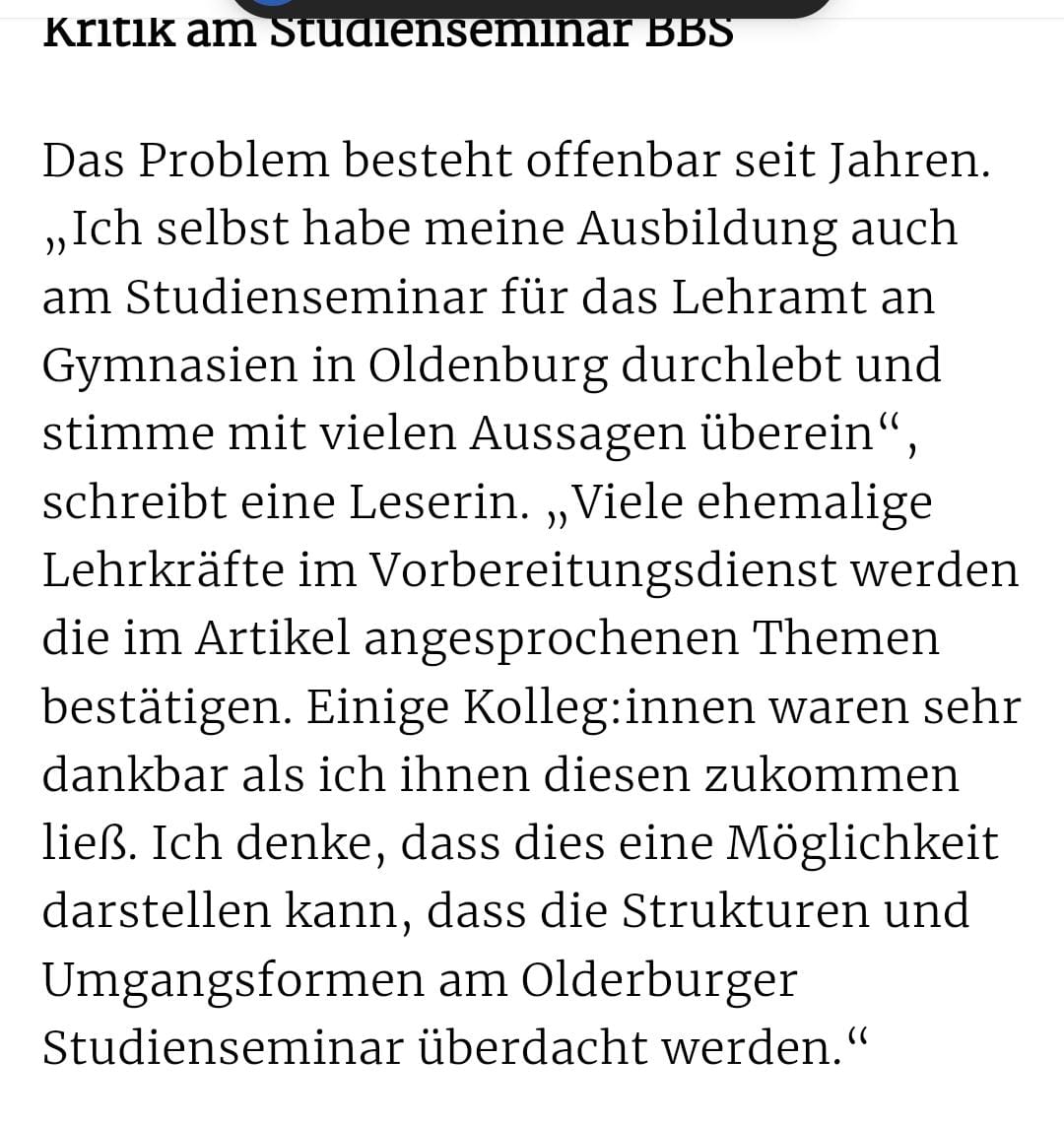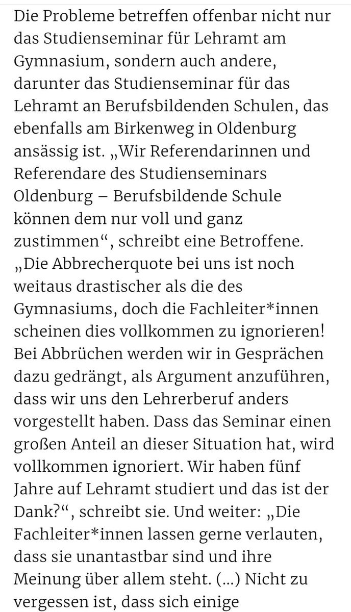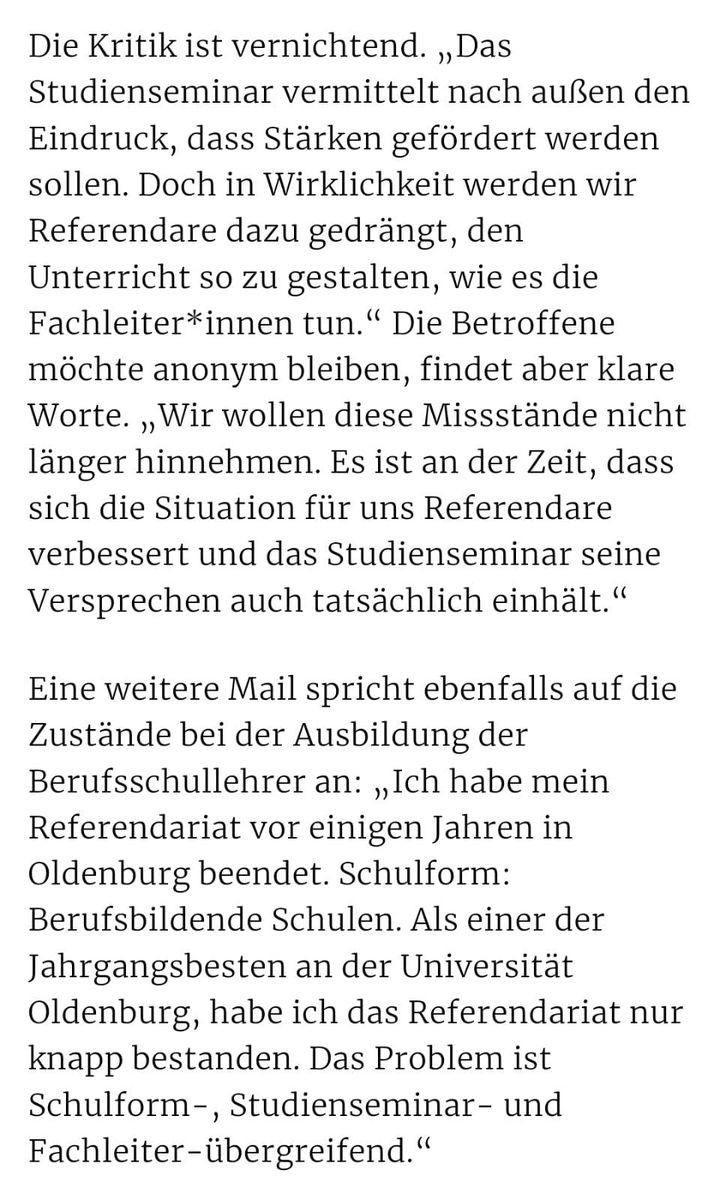 Dafür, dass offenbar derart umfassend berichtet wird über die beiden betroffenen Studienseminare bleibt es inhaltlich doch eher dünn, wenn es darum geht auszuführen, wo genau der Schuh klemmt. Einfach nur Durchfallquoten einzelner Jahrgänge herauszuziehen ohne Kenntnis der individuellen Hintergründe des Nichtbestehens oder Abbrechens zu kennen ist meines Erachtens unseriös (dafür habe ich genügend an meinem Seminar- mit rund 10% Abbrechern/ Nichtbestehern im Kurs- mitbekommen über derartige Vorgänge, um zu wissen, dass das von außen schnell als unfair und intransparent empfunden wird, obgleich die Einzelfälle jeweils glasklar und transparent waren). Auch Begriffe wie "traumatisierend" fallen meines Erachtens an vielen Stellen eher unreflektiert, weshalb ich mich frage, was genau denn systematisch falsch läuft/ laufen soll an diesen Seminaren und nicht nur in einem oder zwei Einzelfällen. Vielleicht kann der/ die TE angstvorrepressalien das auch einfach etwas substantieller und differenzierter gestalten (angefangen mit einer Änderung des Threadtitels, geht es doch nicht pauschal um "norddeutsche Studienseminare", sondern lediglich um zwei Seminare in Oldenburg).