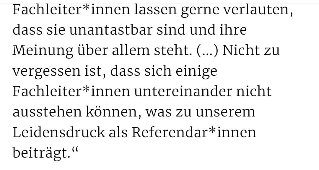 1. FL1 hasst FL2 und wenn beide zusammen in der Besprechung saßen wurde deren Hass auf brutalste Art und Weise am Reffi ausgelassen.2. FL2 lässt mehrere sehr eindeutig sexuelle Sprüche fallen und betont direkt im Anschluss, dass sein Wort dafür sorgen kann, das 5 Jahre + 1,5 Jahre Ref umsonst waren. Danach betont er ebenfalls, dass er auch dafür sorgen kann, gut durchs Referendariat zu kommen wenn man sich entsprechend fügt.