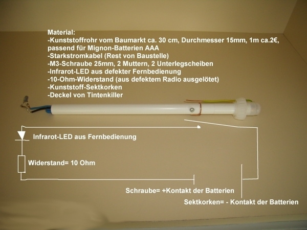 (Im Leerrohr befindet sich die Batteriehalterung für 2 AA-1,5-Volt-Batterien)