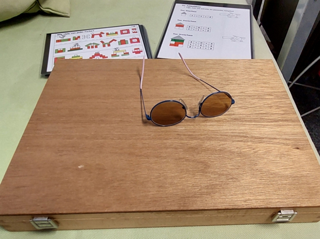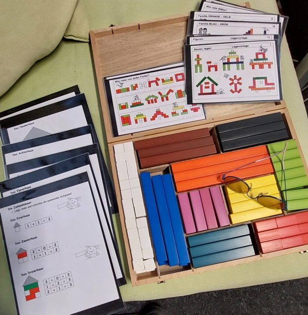 Diesen Holzkoffer mit den großen, sehr gut erhaltenen "Cuisenaire-Stäbchen" brauche ich nicht mehr. Ein paar laminierte Anregungen sind auch dabei. Dir Brille 8_o_) liegt nur drauf, damit ihr eine Vorstellung der Größe bekommt.