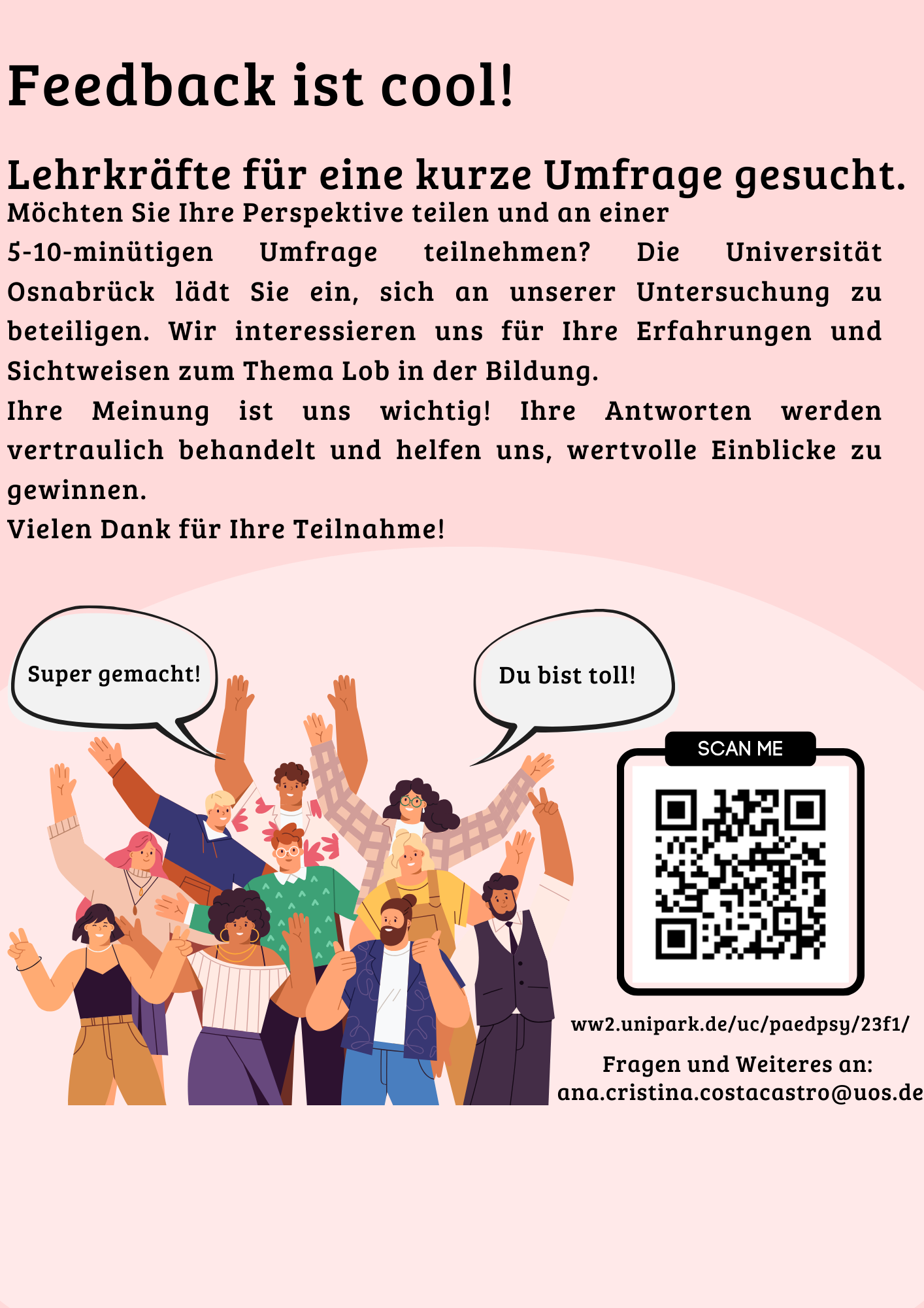 Die Universität Osnabrück lädt Sie ein, sich an unserer Untersuchung zu beteiligen. Wir interessieren uns für Ihre Erfahrungen und Sichtweisen zum Thema Lob in der Bildung.