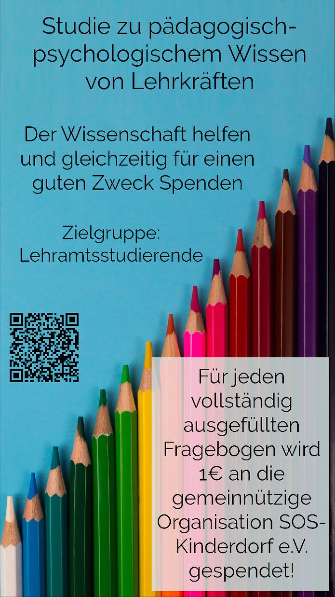 Für eine Abschlussarbeit suche ich noch Lehramtsstudierende, die diese Umfrage ausfüllen. Damit tut ihr gleichzeitig noch etwas Gutes, denn für jeden vollständig ausgefüllten Fragebogen wird 1€ an die gemeinnützige Organisation SOS Kinderdorf e.V. gespendet! Über eure Teilnahme würde ich mich sehr freuen!
