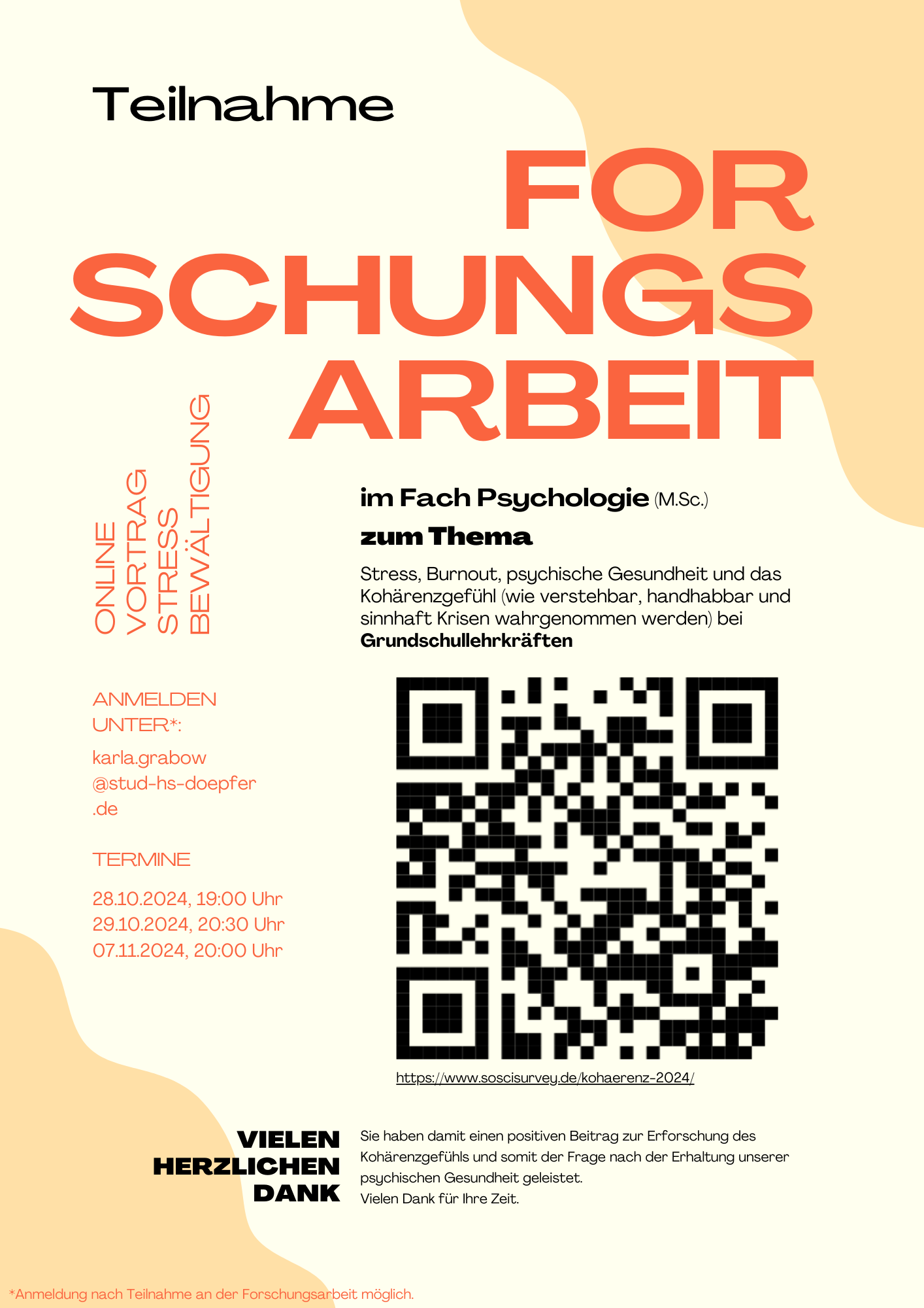 Mein Name ist Karla und ich schreibe aktuell meine Masterarbeit in Psychologie. Wir untersuchen die Anforderungen und Belastungen von Grundschullehrkräften und wie sich diese auf ihre psychische Gesundheit auswirken. Ich hoffe auf ihre Teilnahme und freue mich über ihre Unterstützung, damit die Umstände an deutschlands Grundschulen auch aus Lehrer*innen-Sicht veranschaulicht werden kann.